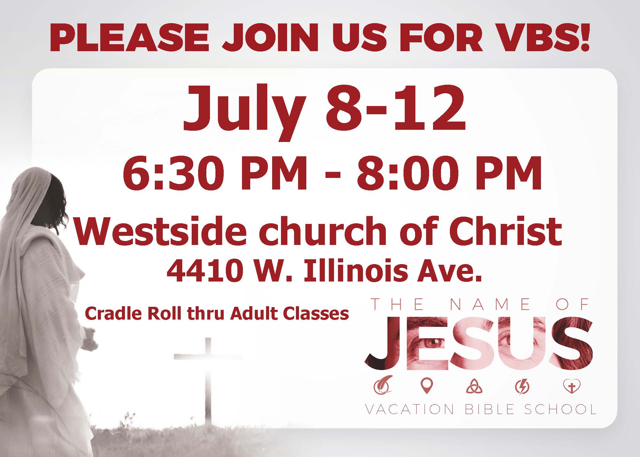 4410 West Illinois Avenue Midland, TX 79703 Directions Westside Church of Christ July 8 – 12, 2024 6:30 pm – 8:00 pm Children, Classes, Community 2024 VBS Share this: Share on X (Opens in new window) X Share on Facebook (Opens in new window) Facebook Share on Pinterest (Opens in new window) Pinterest Email a link to a friend (Opens in new window) Email Like this:Like Loading... Related
